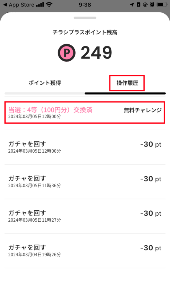 アプリ上部のポイント表記横にある「履歴」をタップし、「操作履歴」のタブを選択して交換した履歴が残っているかご確認ください。